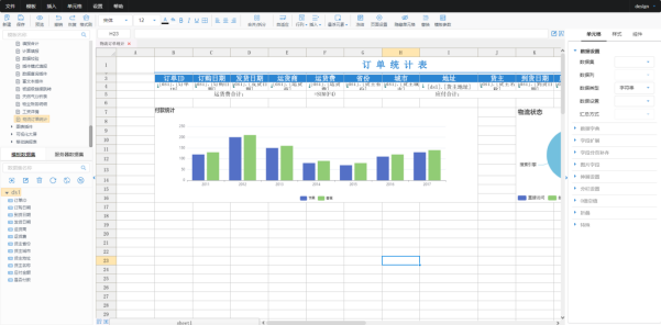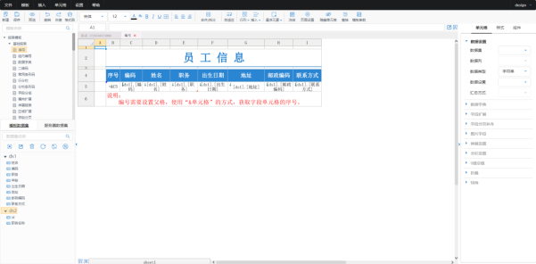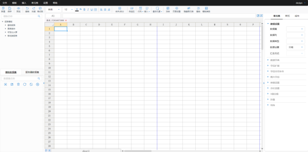 在创建后的模板工作区域中,默认提供报表设计工作区域,在工作区域通过拖拽字段,设计单元格属性、样式等方式制作报表模板的设计,最终形成模板文件保存。