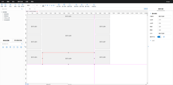 在画布工作区域内,通过右键“插入悬浮元素”菜单,插入悬浮元素,并对齐进行布局操作。