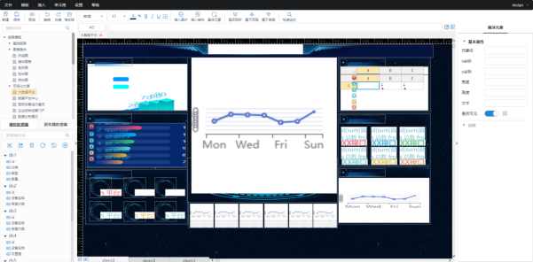 再根据实际的业务,在各个悬浮元素上插入相应的图表插件,并设置相应的属性,最终形成可视化模板文件。