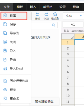 创建新模板:设计器开发者可以创建新的报表模板。点击菜单栏的“文件”,再点击“新建”,或者在工具栏中直接点击“新建”按钮,弹出模板名称输入框,输入未保存过的模板名称,即可创建新的模板。